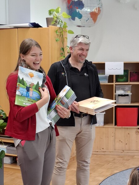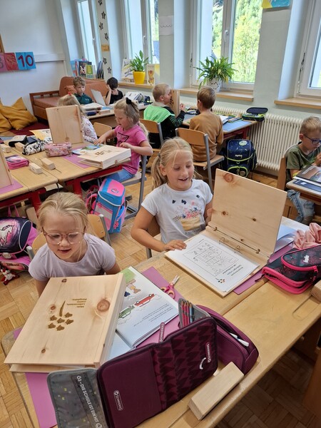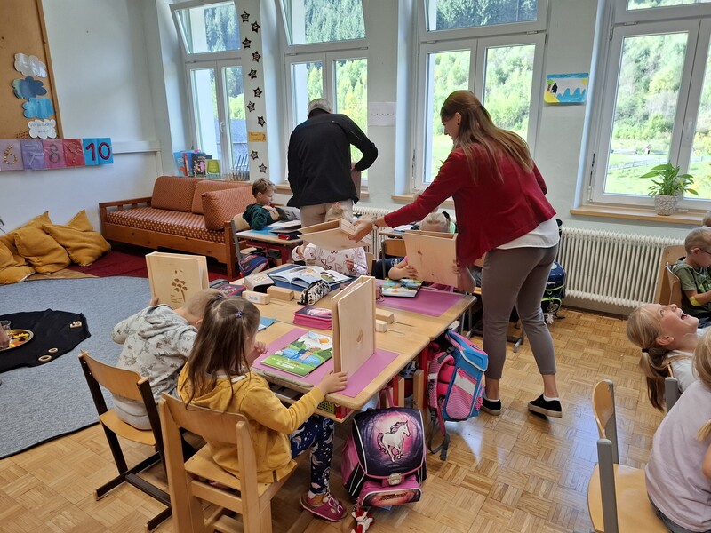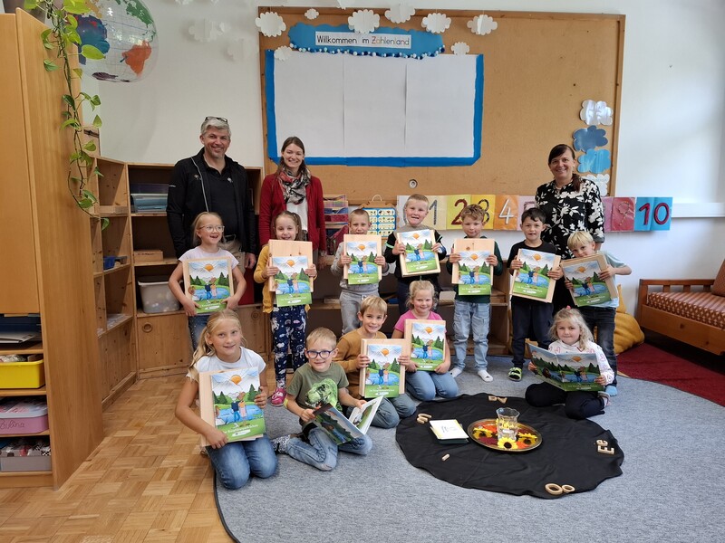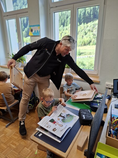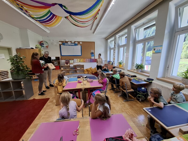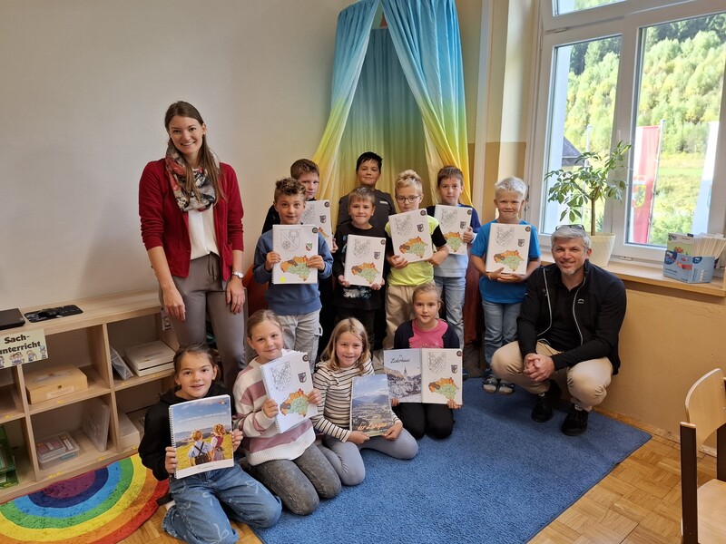 Die Kinder der 1. Klasse werden mit einer wunderschönen Zirbenmappe und dem Biosphärenpark-Buch beschenkt. Die 3.Klassler erhalten das Lungauer Sachunterrichtsbuch - drei wertvolle Schätze, die es nirgends zu kaufen gibt.